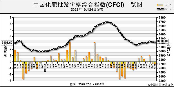 10月24日中國化肥批發(fā)價格綜合指數(CFCI)為3210.19點,環(huán)比下跌12.99點,跌幅為0.40%;同比下跌30.27點,跌幅為0.93%;比基期上漲831.35點,漲幅為34.95%。